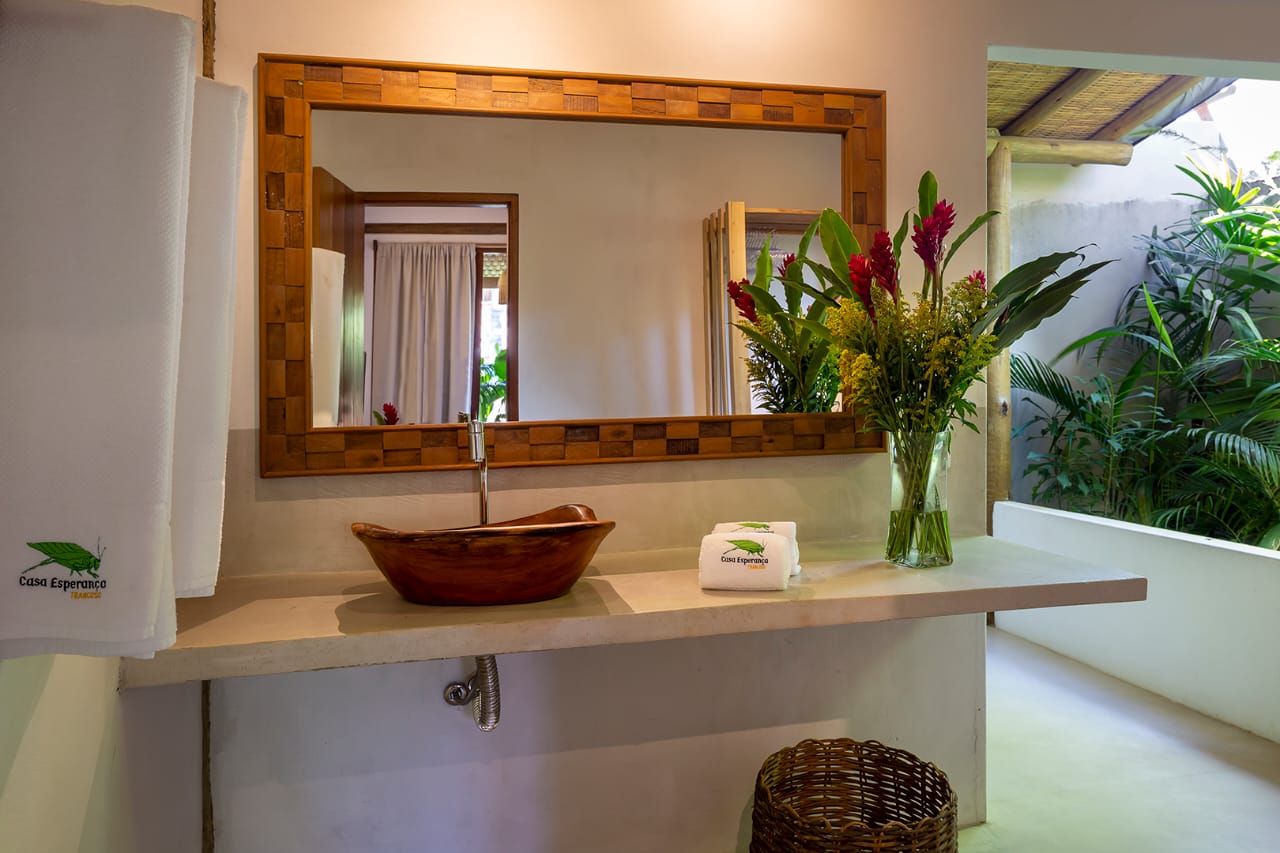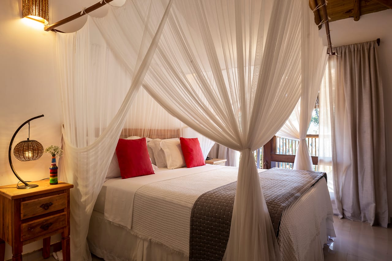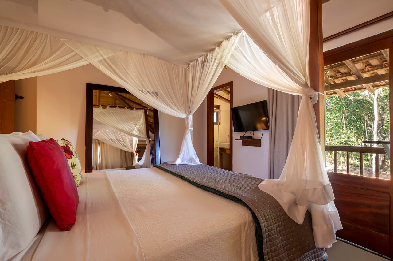 • Quarto 6: Cama Queen com mosquiteiro e criado-mudo (parte superior, banheiro ao lado)