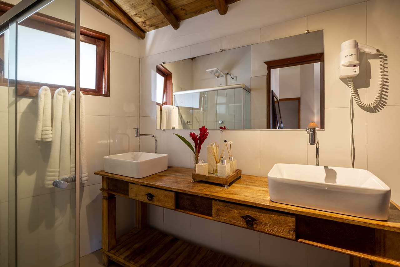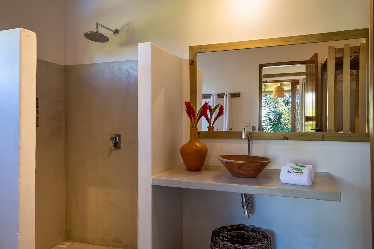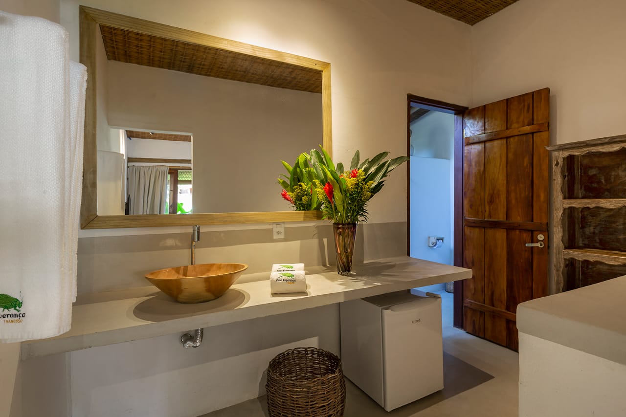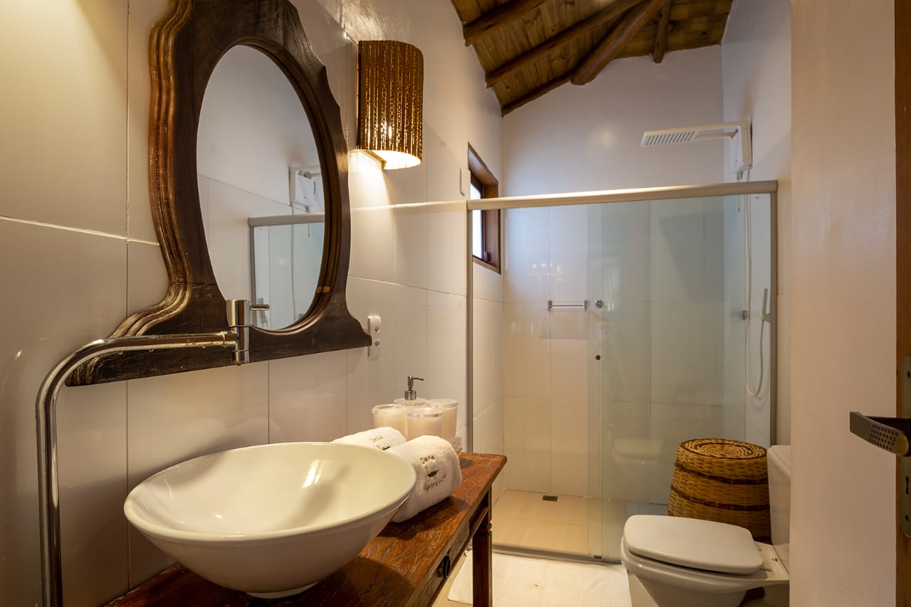 • Quarto 6: Cama Queen com mosquiteiro e criado-mudo (parte superior, banheiro ao lado)