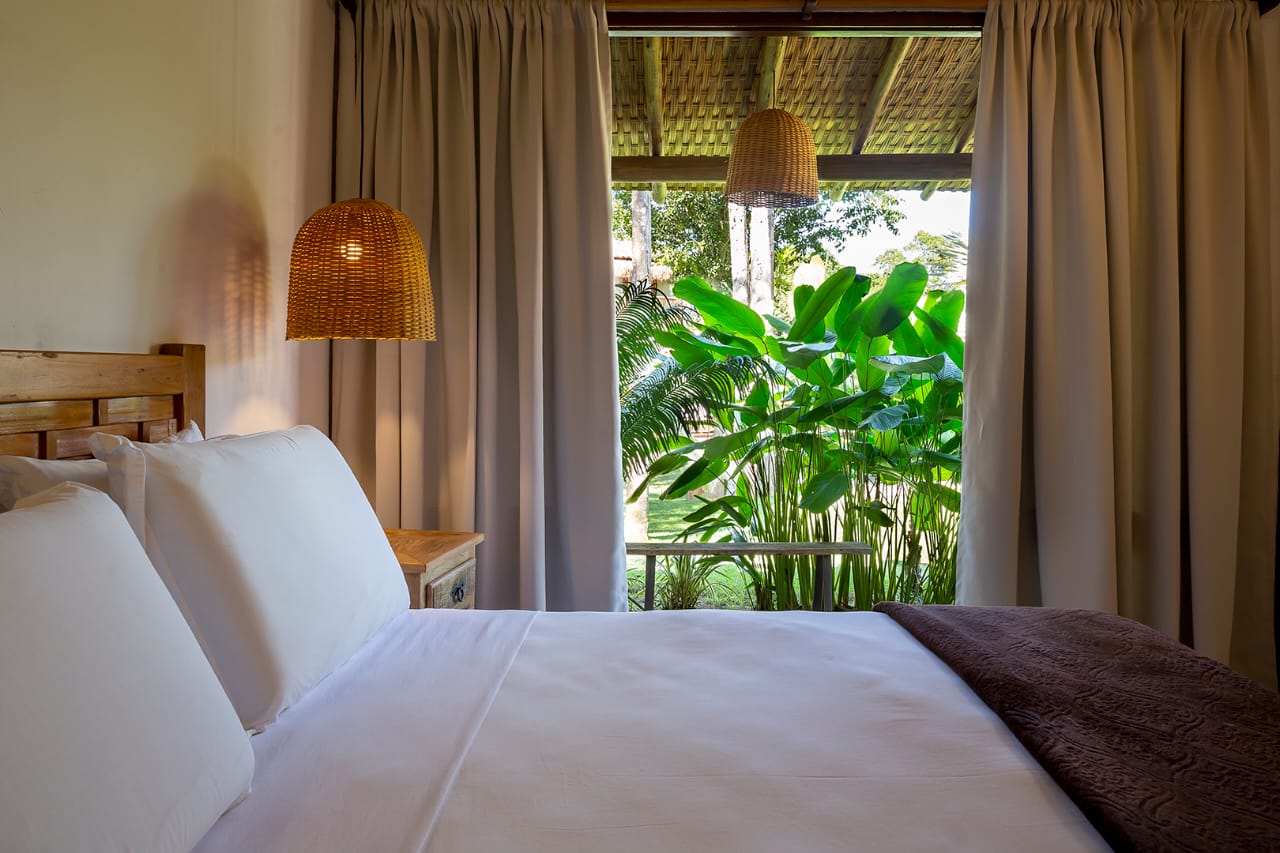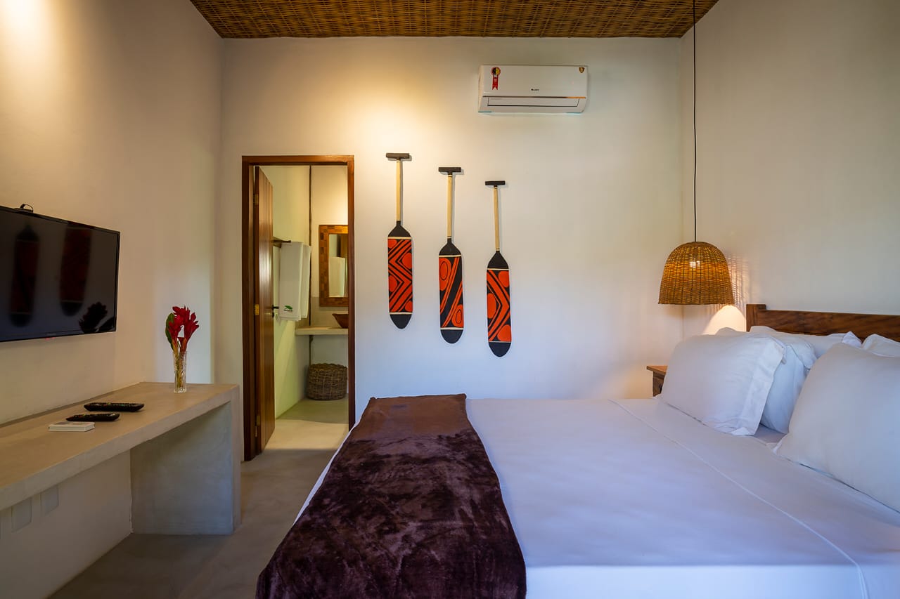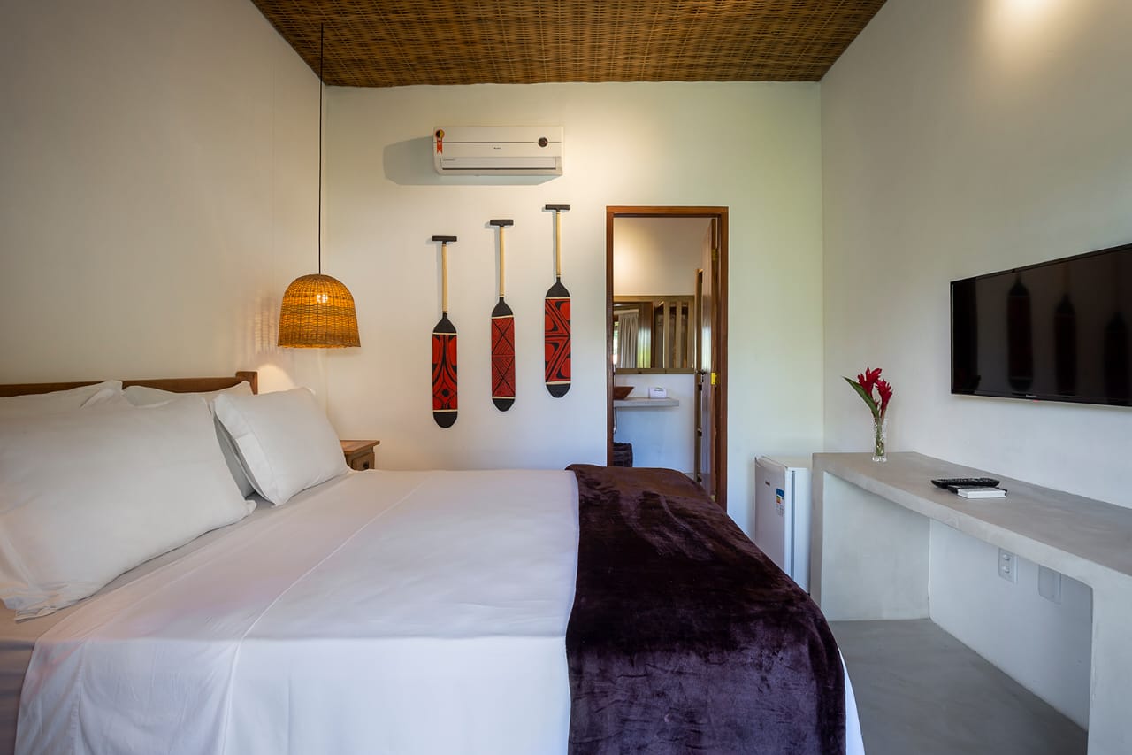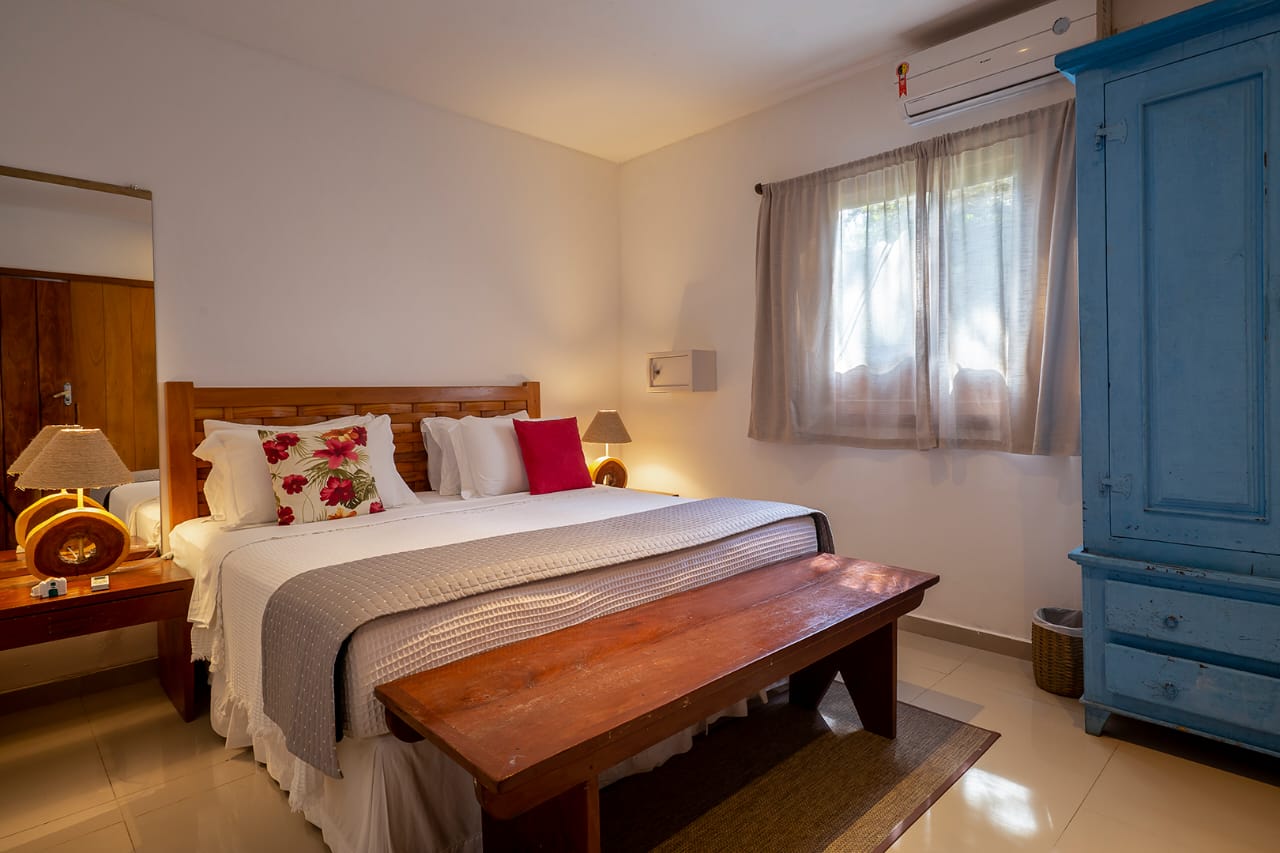 • Quarto 7: Cama Queen com mosquiteiro e criado-mudo (parte superior, banheiro ao lado)