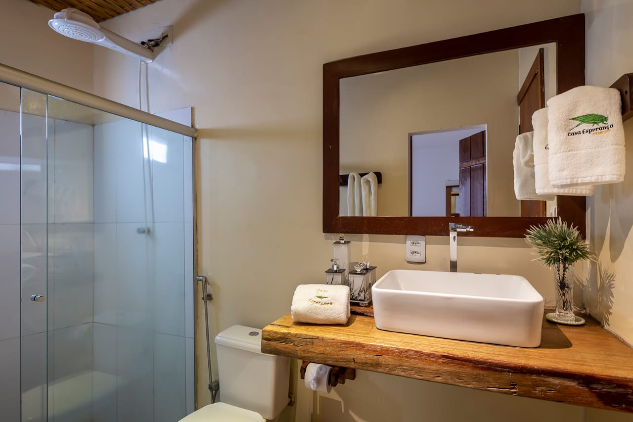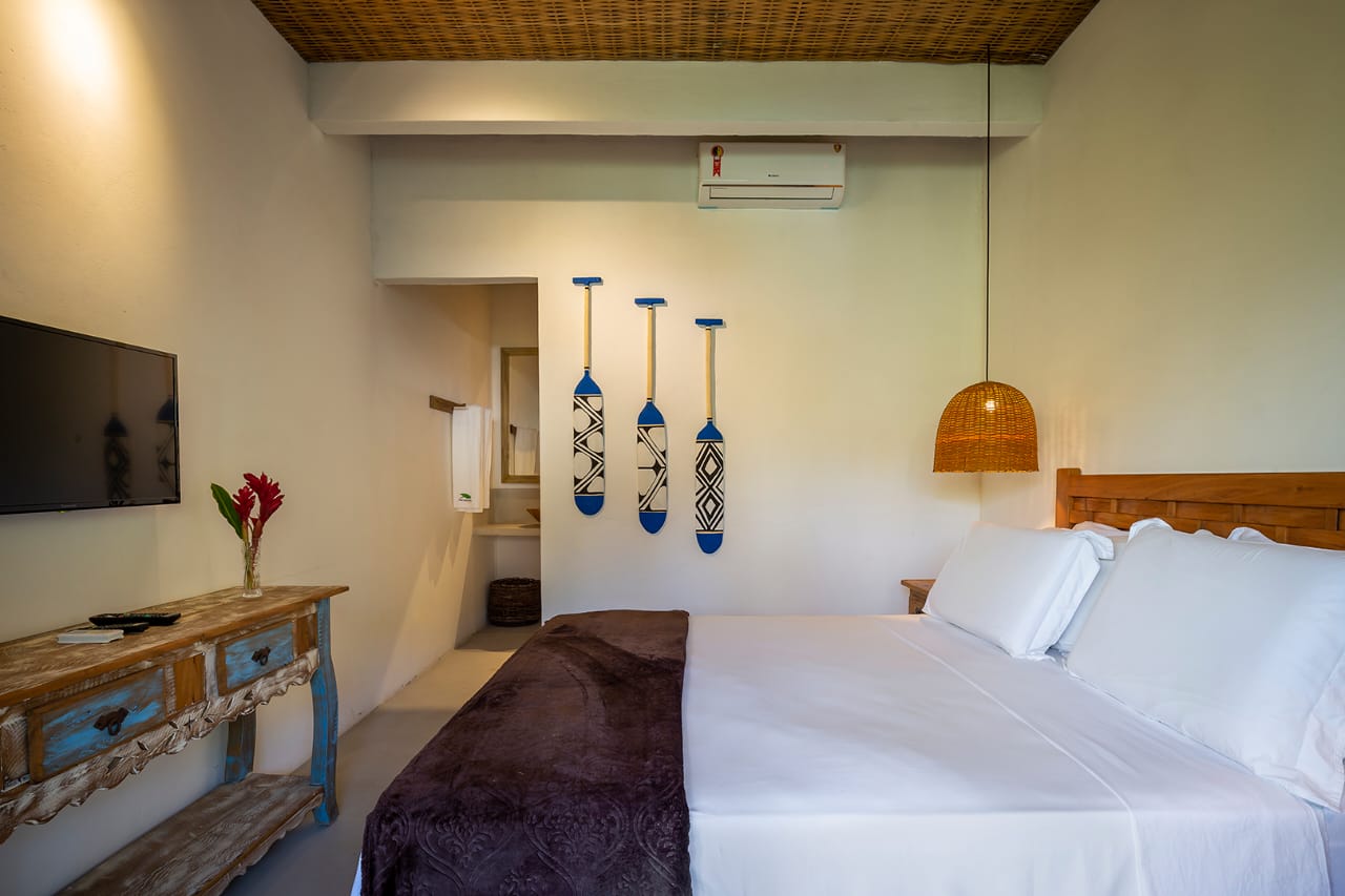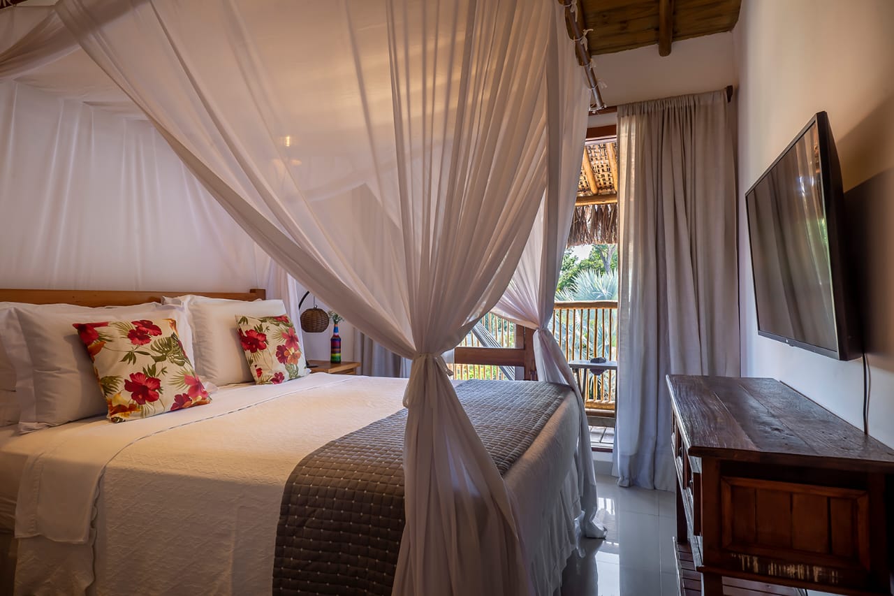 • Suíte 5: Cama Queen com mosquiteiro, criado-mudo e TV (parte anexa da casa)
